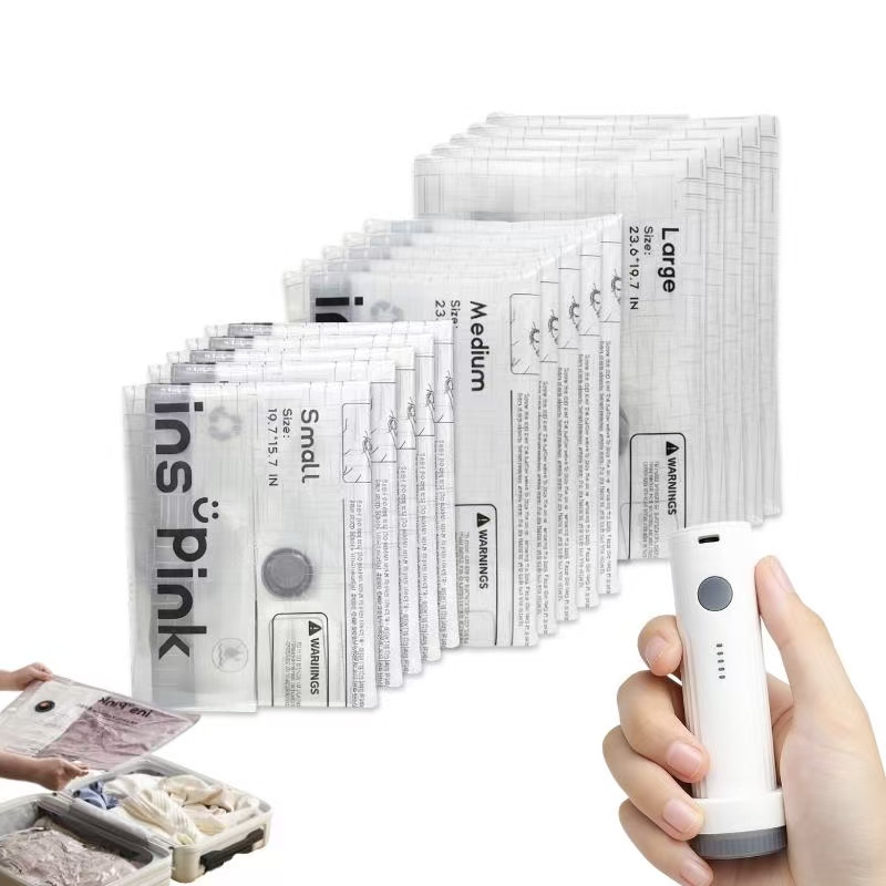 Inspink Cordless Travel Vacuum Compression Bags come with a 25W Wireless USB Pump and a 1500mAh battery. These bags save up to 80% space in your suitcase. The durable, waterproof, and reusable bags are perfect for business trips, vacations, or backpacking.